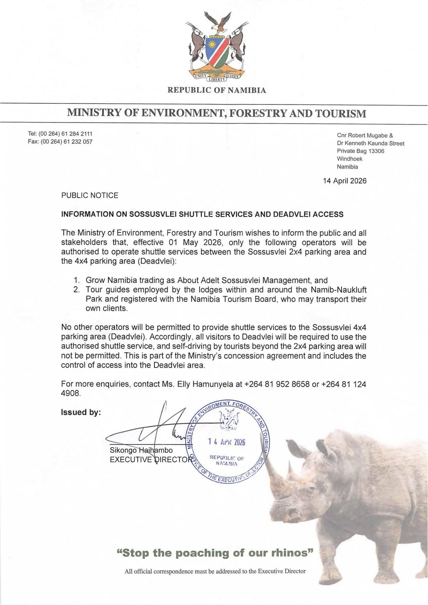 Laut der veröffentlichten Bekanntmachung dürfen ab dem 01.05.2026 nur noch bestimmte autorisierte Betreiber Shuttle-Services zwischen dem Sossusvlei-2x4-Parkplatz und dem Deadvlei anbieten. Andere Betreiber sind dafür nicht zugelassen. Außerdem wird ausdrücklich festgehalten, dass Selbstfahrer mit ihren eigenen Fahrzeugen diesen letzten Abschnitt nicht mehr befahren dürfen.